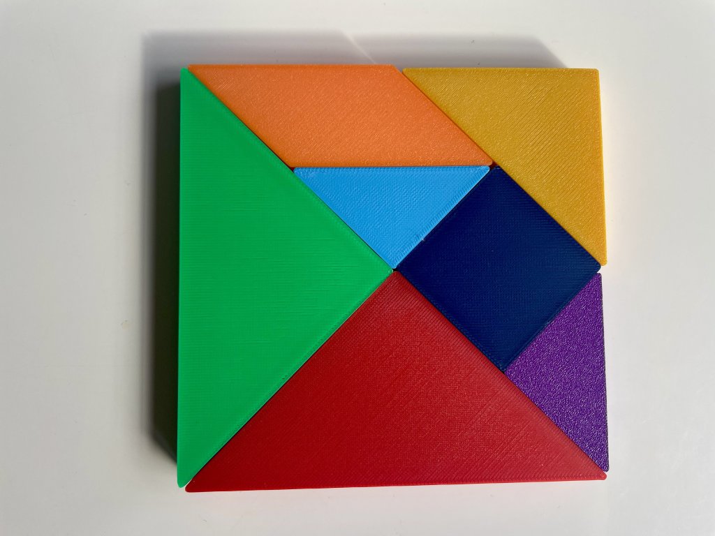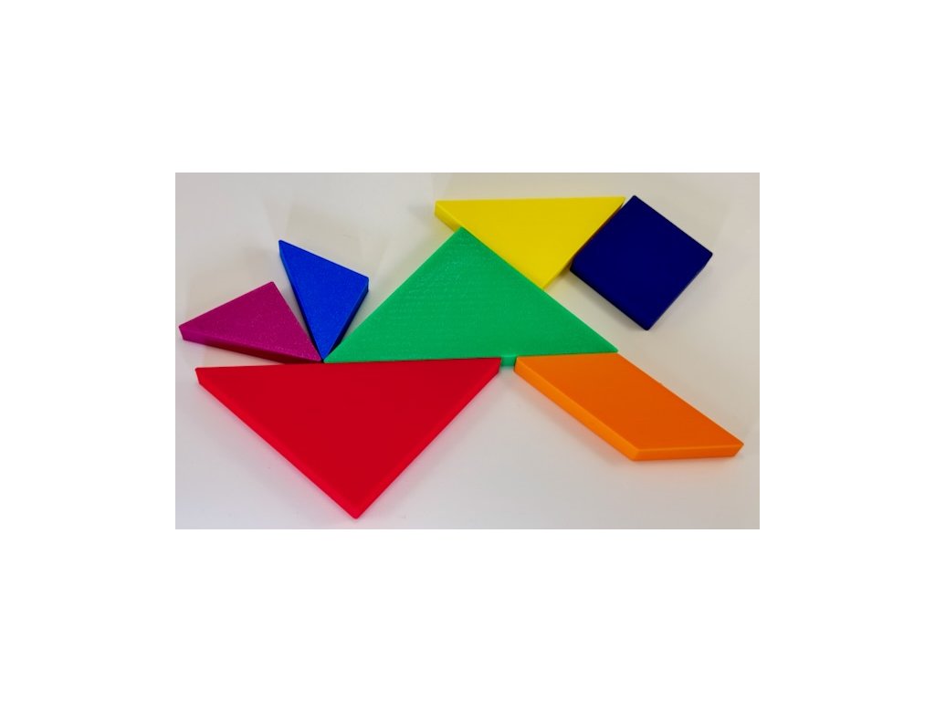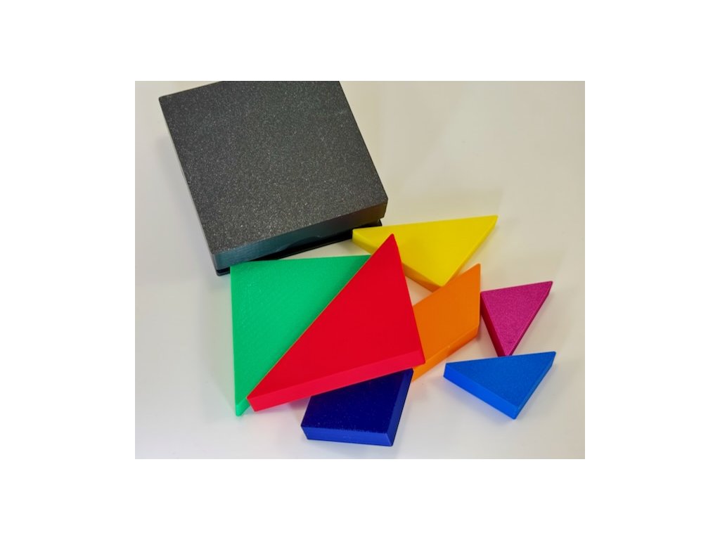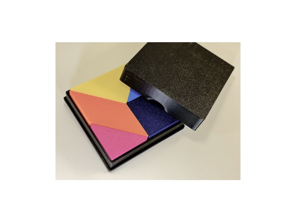 V setu je krabička s víčkem 9,3 x 9,3 x 2,5 cm a uvnitř 7 ks barevných obrazců s tloušťkou 1 cm.
